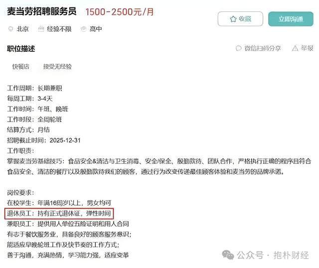 日前,北京一家麦当劳招聘退休员工,提出的招聘要求是:退休员工需要拥有正式退休证,上班是弹性工作制,每周上3天-4天班,工资为每月1500元—2500元。